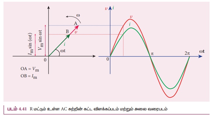 (படம் 4.41). மின்னழுத்த வேறுபாடு மற்றும் மின்னோட்டம் ஒரே கட்டத்தில் உள்ளதை அலை வரைபடமும்