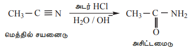 ஆல்கைல் சயனைடுகளை, குளிர்ந்த , அடர் HCl கொண்டு பகுதியளவு நீராற்பகுக்கும்போது அமைடுகள் உருவாகின்றன.