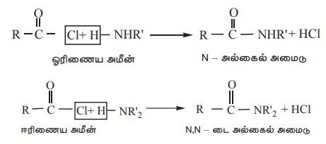 4) 1° மற்றும் 2° அமீன்களுடன் வினைப்பட்டு N-ஆல்கைல் அமைடுகளைத் தருகின்றன.
