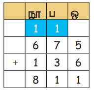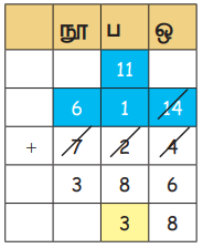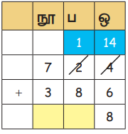 7 நூறுகளிலிருந்து 1 நூறினைப் பெற்று அதனுடன் 1 பத்தினைக்கூட்ட, பத்தாம் இடத்தில் 11-ஐப் பெறலாம்