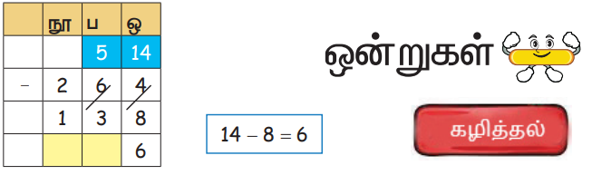 4 ஒன்றுகளிலிருந்து 8 ஒன்றுகளைக் கழிக்க முடியாது. எனவே 6 பத்துகளிலிருந்து ஒரு பத்தினை பத்து ஒன்றுகளாக இனமாற்றம் செய்து ஒன்றுகளுடன் கூட்டுக.
