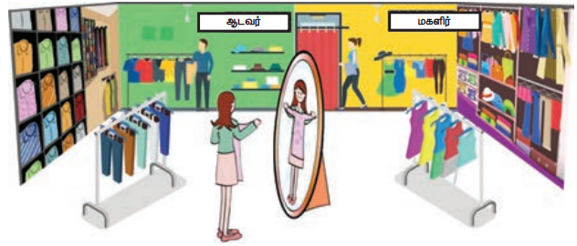 கொடுக்கப்பட்டுள்ள துணிக்கடை படத்திலிருந்து பொருத்தமான கேள்விகளை உருவாக்குக