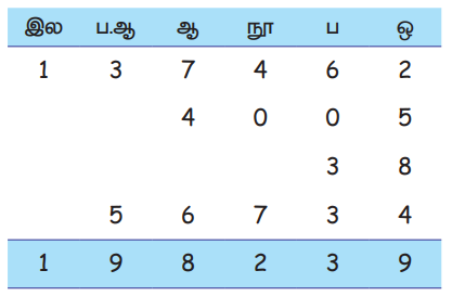 கொடுக்கப்பட்ட எண்களை அதன் இடமதிப்பிற்கேற்ப வரிசைப்படுத்தவும். அனைத்து விதமான கூட்டல் கணக்குகளையும் இந்த முறையில் நாம் செய்யலாம்.