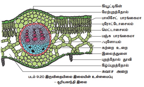 சூரியகாந்தி இலையின் குறுக்கு வெட்டுத்தோற்றத்தில் புறத்தோல், இலையிடைத் திசு, வாஸ்குலத் திசுக்கள் என தெளிவாகப் புலப்படுகின்றன.