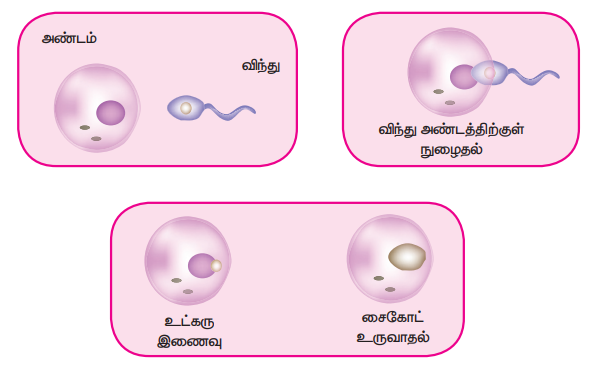 உட்கருவும் இணைந்து ஒரே உட்கருவை உருவாக்குகின்றன. இதன் விளைவாக ஸைகோட் எனப்படும் கருவுற்ற