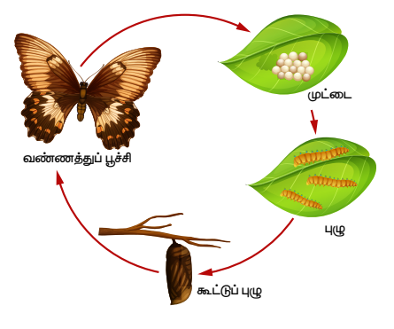 உதாரணமாக, வண்ணத்துப் பூச்சியில் முட்டை, லார்வா, பியூபா மற்றும் வளர்ந்த பூச்சி என வேறுபட்ட வளர்ச்சி நிலைகள் காணப்படும். இதன்