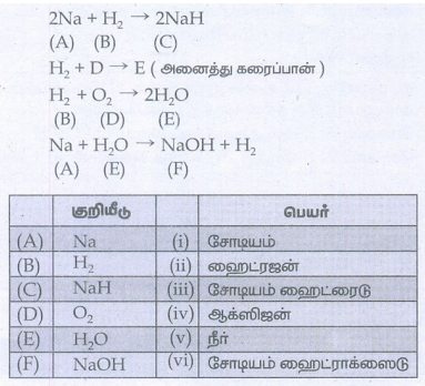 38. பொதுவாக பயன்படுத்தப்படும் உப்பில் உள்ள ஒரு முதல் தொகுதி உலோகம் (A) ஆனது (B) உடன் வினைபுரிந்து (C) என்ற சேர்மத்தினைத் தருகிறது. இச்சேர்மத்தில் ஹைட்ரஜன் -1 ஆக்சிஜனேற்ற நிலையில் காணப்படுகிறது. (B) ஆனது (D) என்ற வாயுவுடன் வினைப்பட்டு அனைத்துக் கரைப்பானான (E) ஐத் தருகிறது. சேர்மம் (D) ஆனது (A) உடன் வினைப்பட்டு (F) என்ற ஒரு வலிமையான காரத்தினைத் தருகிறது. A, B, C, D, E மற்றும் F யைக் கண்டறிக. வினைகளை விளக்குக.