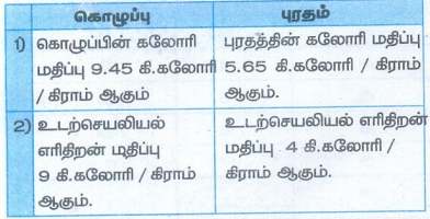 21. கலோரி மதிப்பின் அடிப்படையில் புரதத்திற்கும் கொழுப்பிற்கும் இடையிலான வேறுபாடு மற்றும் உடலில் இவற்றின் பங்கு குறித்து எழுதுக.