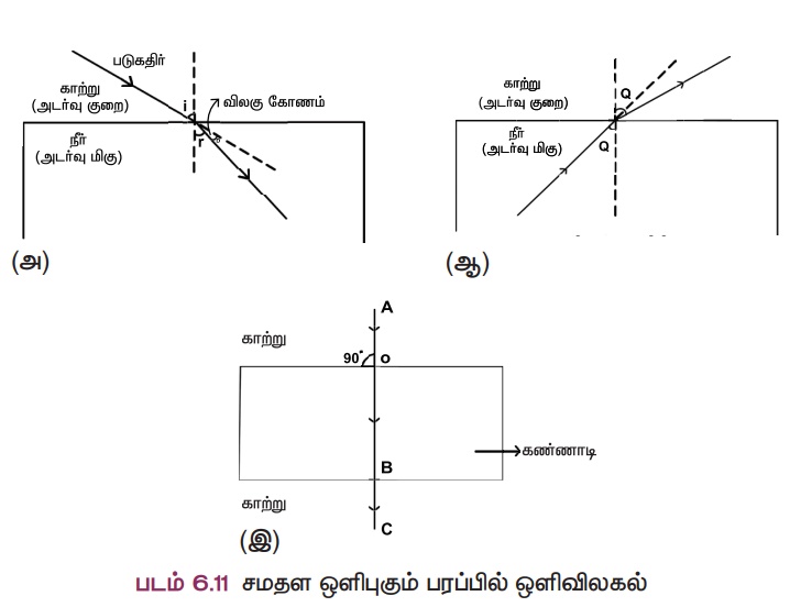 காரணம்: விலகு கதிர் அடர் மிகு ஊடகத்தில் குத்துக்கோட்டை நோக்கி விலகிச் செல்லும்.