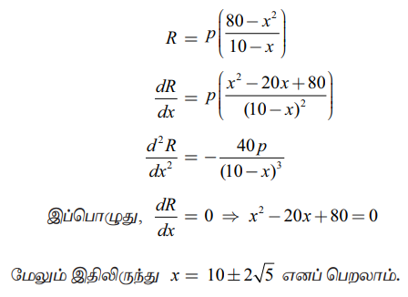 நாள் ஒன்றிற்கு பணவரவை R = px + 2py = px + 2p (40 – 5x / 10 – x) ஆகவே நாம் R-ஐ பெருமமாக்க வேண்டும். R -ஐ x -ஐப் பொருத்து வகையிட,