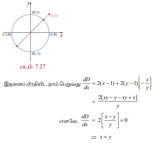 இங்கு கட்டுப்பாடானாது x2 + y2 =1 ஆகும். இப்பொழுது, dD/dx = 2(x-1) + 2(y-1) × dy/dx. இங்கு dy/dx -யினை x2 + y2 =1-ஐ வகையிட்டு கணக்கிடலாம். எனவே, 2x + 2y dy/dx = 0 ⇒ dy/dx = - x/y இதனைப் பிரதியிட நாம் பெறுவது dD/dx = 2(x-1) +2(y-1) (-x/y)