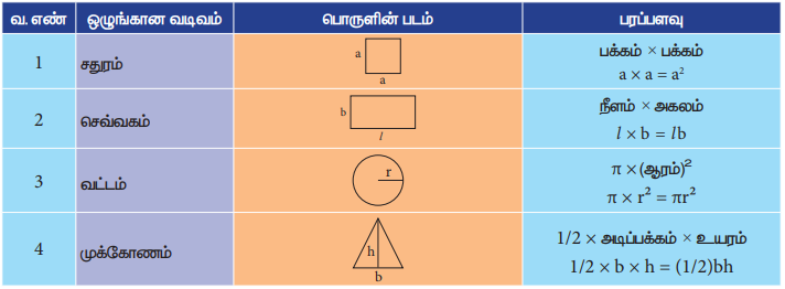அட்டவணை 1.3 ஒழுங்கான வடிவமுள்ள பொருள்களின் பரப்பளவு