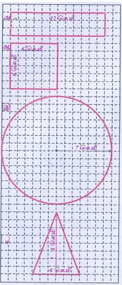 கீழே தரப்பட்டுள்ள ஒழுங்கான வடிவமுள்ள பொருள்களின் அளவுகளை, ஒரு வரைபடத் தாளின் மீது வரைந்து, அவற்றின் பரப்பளவினை வரைபட முறையில் காணவும். மேலும், அவற்றின் பரப்பளவினை தகுந்த சூத்திரத்தின் மூலமும் கண்டறியவும். இரு முறைகளிலும் கிடைத்த மதிப்புகளை அட்டவணைப்படுத்தி, அவற்றை ஒப்பிடவும்