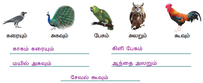 பறவைகளின் ஒலிகளை அறிந்து கோடிட்ட இடங்களை நிரப்புவோம்.