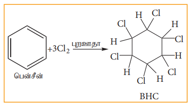 சூரிய ஒளி அல்லது புற ஊதா ஒளி முன்னிலையில், பென்சீன், மூன்று Cl2 மூலக்கூறுகள் உடன் வினைப்பட்டு பென்சீன் ஹெக்சா குளோரைடை (BHC) C6H6Cl6 தருகின்றது. இது கேமக்சேன் அல்லது லிண்டேன் என அழைக்கப்படுகின்றது. இது ஒரு சிறந்த பூச்சிகொல்லி மருந்தாகும்.