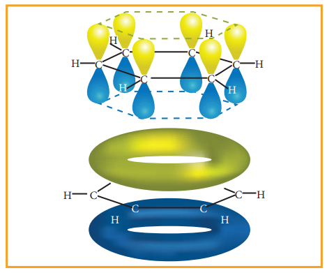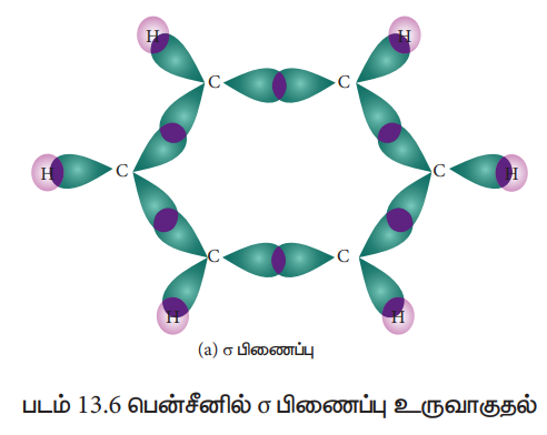 படம் 13.7 அனைத்து கார்பன் அணுக்களும் P -ஆர்பிட்டாலைக் கொண்டுள்ளன. ஆறு p -ஆர்பிட்டால்கள் ஒன்றுடன் ஒன்று கலந்து உள்ளடங்கா மூலக்கூறு ஆர்பிட்டாலைத் தருகின்றது.