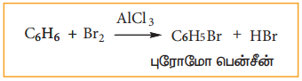 AlCl3 முன்னிலையில் பென்சீன் புரோமினுடன் வினைபட்டு மோனோபுரோமோ பென்சீனைத் தருகின்றது.