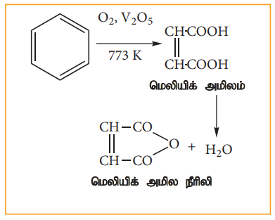 பென்சீன் வலிமை மிகு ஆக்சிஜனேற்றியுடன் வினைபுரியாமல் நிலைப்புத்தன்மை உடையதாக உள்ளது ஆனால் 773K வெப்பநிலையில், V2O5 முன்னிலையில், பென்சீனின் வாயுவை ஆக்சிஜனுடன் கலந்து செலுத்தும் போது ஆவி-நிலை ஆக்சிஜனேற்றம் அடைகின்றது. இங்கு வளையம் உடைபட்டு மெலியிக் அமில நீரிலி உருவாகின்றது.