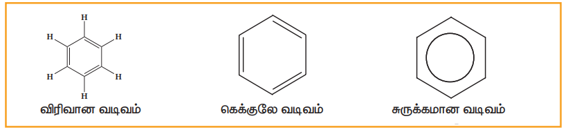 • அலகு 11ல் அரோமேட்டிக் ஹைட்ரோ கார்பன்களை பெயரிடும் முறையினை நாம் கற்றுள்ளோம். அரோமேட்டிக் ஹைட்ரோ கார்பனின் முதல் சேர்மம் பென்சீன் ஆகும். வளைய ஹெக்சேன் அமைப்பில் ஒரு வட்டம் வரையப்பட்டு இது குறிப்பிடப்படுகிறது.