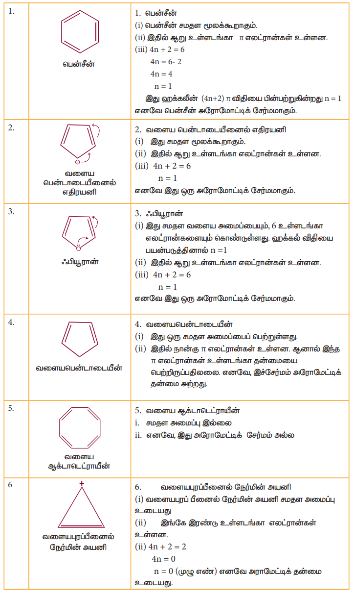 (iii) வளையத்தில் (4n+2) π எலக்ட்ரான்கள் இருக்க வேண்டும். இங்கு n என்பது முழுக்கள் ஆகும். (n=0,1,2....)
