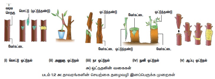 ஆ) ஒட்டுதல் (Grafting): இம்முறையில் இரண்டு வெவ்வேறு தாவரங்களின் பாகங்கள் இணைக்கப்பட்டு அவை தொடர்ந்து ஒரே தாவரமாக வளர்கின்றன. இந்த இரண்டு தாவரங்களில் தரையுடன் தொடர்புடைய தாவரம் வேர்கட்டை (stock) என்றும் ஒட்டுதலுக்கு பயன்படுத்தப்படும் தாவரம் ஒட்டுத்தண்டு (scion) என்றும் அறியப்படுகின்றன (படம் 1.2 அ). எடுத்துக்காட்டுகள்: எலுமிச்சை, மா மற்றும் ஆப்பிள். வேர்கட்டை மற்றும் ஒட்டுத்தண்டு இடையே ஏற்படும் இணைப்பைச் சார்ந்து பல்வகை ஒட்டுதல் உள்ளன. அவை (i) மொட்டு ஒட்டுதல் (ii) அணுகு ஒட்டுதல் (ii) நா ஒட்டுதல் (iv) நுனி ஒட்டுதல் (v) ஆப்பு ஒட்டுதல் என்பனவாகும்.