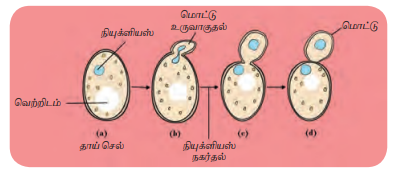 நாம் அடுமனைக்குச் (Bakery) சென்றால் அங்கே பல்வேறு கேக் வகைகளைக் காணலாம். இவை மிகவும் மென்மையானவை. இதற்குக் காரணம் ஈஸ்ட் என்ற ஒரு செல் உயிரியே. ஒரு தனித்த ஈஸ்ட் சமமற்ற பகுப்படைந்து ஒரு சிறிய மொட்டினைத் தோற்றுவிக்கின்றது. இது படிப்படியாக வளர்ந்து தாய் செல்லிலிருந்து விடுபட்டு புதிய ஈஸ்ட் செல்லாக மாறுகிறது. இதற்கு மொட்டு விடுதல் என்று பெயர்.