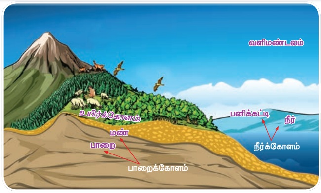 உயிர்க்கோளம் என்பது பாறைக்கோளம், நீர்க்கோளம் மற்றும் வளிமண்டலம்