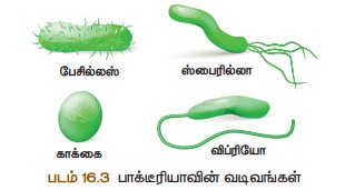 • விப்ரியோ : கமா வடிவ பாக்டீரியா எ.கா. விப்ரியோ காலரா.