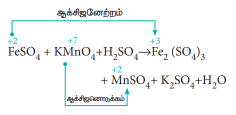b) ஒரு எலக்ட்ரானை இழப்பதால், FeSO4 ல் உள்ள Fe ன் ஆக்சிஜனேற்ற எண் +2லிருந்து +3ஆகக் அதிகரிக்கிறது.