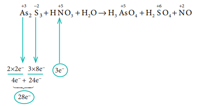 ⇒ 3As2S3 + 28HNO3 + H2O → 6H3AsO4 + 9H2SO4 + 28NO