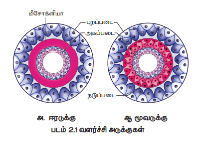 கருவளர்ச்சியின் போது திசுக்கள் உறுப்புகள், இரண்டு அல்லது மூன்று கருமூலப்படை (Embryonic germ layer) அடுக்குகளிலிருந்து தோன்றுகின்றன. தோற்றம் மற்றும் கருவளர்ச்சியின் அடிப்படையில் ஈரடுக்கு மற்றும் மூவடுக்கு விலங்குகள் என இரண்டு வகைகளாகப் பிரிக்கப்பட்டுள்ளன. புறப்படை மற்றும் அகப்படை என இரு அடுக்குகளைக் கொண்ட விலங்குகள் ஈரடுக்கு விலங்குகள் என அழைக்கப்படுகின்றன. இதில் புறப்படையிலிருந்து மேற்புறத்தோலும் அகப்படையிலிருந்து குடற்சுவர் அடுக்கும் (Gastrodermis) தோன்றுகின்றன. புறப்படை மற்றும் அகப்படைக்கு இடையில் மாறுபாடு அடையாத மீசோக்ளியா அடுக்கு காணப்படுகிறது. (எ.கா) பவளம், ஜெல்லி மீன், கடல் சாமந்தி.