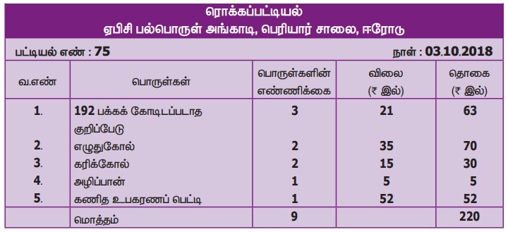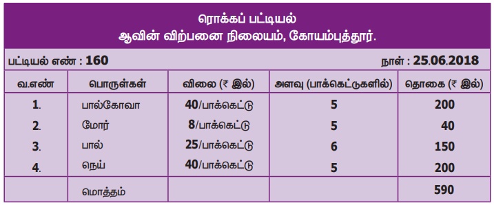 எடுத்துக்காட்டு 2: கோயம்புத்தூரிலுள்ள ஆவின் விற்பனை நிலையத்தில் 25.06.2018 அன்று வாங்கப்பட்ட பின்வரும் பொருள்களுக்கு பட்டியல் எண் 160 உள்ள பட்டியல் தயார் செய்க.