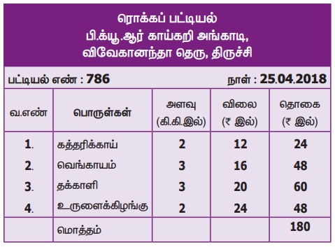 பெட்டிக் கடைக்காரர் அதற்கான பட்டியலைத் தரவில்லை. ஆகவே, அறிவு பின்வருமாறு தானே பட்டியல் தயாரிக்கிறார். தான் செலுத்திய தொகையைச் சரிபார்க்க இது அவருக்கு உதவுகிறது.