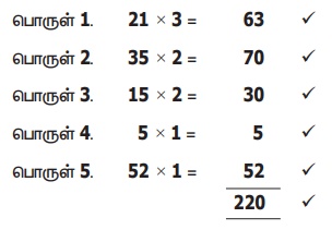 செயல்பாடு: இந்தப் பட்டியல் மீது மேலும் சில வினாக்களை எழுப்புக. ஓர் கரிக்கோல் விலை என்ன? பொருள்களின் எண்ணிக்கை எவ்வளவு ?