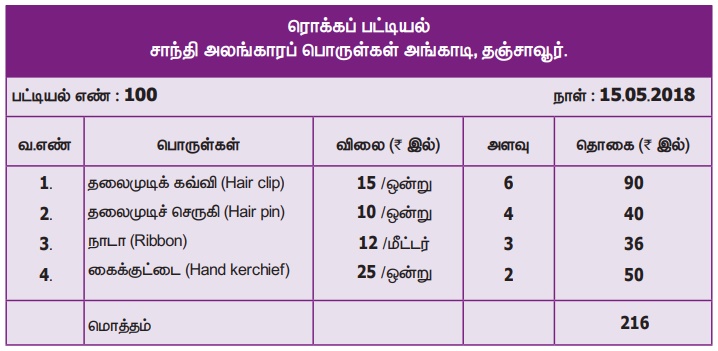 எடுத்துக்காட்டு 1: இரம்யா சில ஒப்பனைப் பொருள்களை வாங்கிக் கொண்டு பின்வரும் பட்டியலைப் பெறுகிறார்.