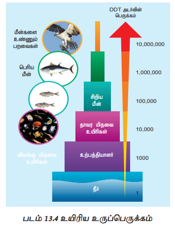 சிதைவடையாப் பொருட்கள் உணவுச் சங்கிலியினுள் நுழையும் பொழுது, அவை வளர்சிதைமாற்றமடைவதில்லை அல்லது சிதைக்கப்படுவதில்லை அல்லது வெளியேற்றப்படுவதுமில்லை. அதற்கு பதிலாக உணவுச் சங்கிலியின் அடுத்தடுத்த ஊட்ட நிலைகளுக்கு இடம் மாற்றப்படுகின்றன. இச்செயல்களின் போது அவற்றின் அடர்வு அதிகரிக்கின்றது. இது உயிரிய உருப்பெருக்கம் எனப்படுகிறது. இதன் விளைவாக நச்சுத்தன்மை அதிகரிக்கும் அல்லது இறப்பு கூட ஏற்படலாம். பாதரசம் மற்றும் DDT ஆகியவற்றில் இது உறுதி செய்யப்பட்டுள்ளது. படம் 13.4ல் கொடுக்கப்பட்டுள்ள DDT - யின் உயிரிய உருப்பெருக்கம், நீர்ம உணவுச் சங்கிலியில் DDT - யின் அடர்வு எவ்வாறு அடுத்தடுத்த ஊட்ட நிலையில் அதிகரிக்கிறது என்பதைக் காட்டுகிறது.