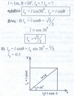 1. துகளொன்றின் நிலை வெக்டரின் நீளம் 1m. அது x அச்சுடன் 30° கோணத்தில் உள்ளது எனில், நிலைவெக்டரின் x மற்றும் y கூறுகளின் நீளங்களைக் காண்க.