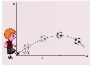 17. ஒரு கால்பந்து வீரர் 20 ms-1 திசைவேகத்தில் கிடைத்தளத்துடன் 30° கோணத்தில் பந்து ஒன்றினை உதைக்கிறார். பந்தின் இயக்கம் படத்தில் காட்டப்பட்டுள்ளது. இலக்குக் கம்பங்கள் (goal post) அவரிடமிருந்து 40m தொலைவில் உள்ளன, பந்து இலக்கினை அடையுமா?