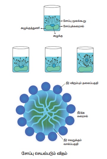 கொள்கிறது. இவ்வாறாக சோப்பின் முனைவற்ற பகுதி அழுக்கை சுற்று கொள்கிறது. சோப்பின்