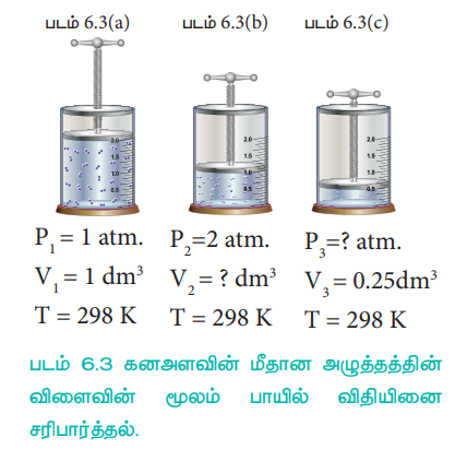 படம் (6.3)ல் விடுபட்ட அளவீடுகளை (6.3 (b)ல் கனஅளவு மற்றும் 6.3 (c)ல் அழுத்தம்) கண்டறிவோம்.
