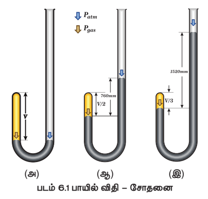 வாயுக்களின் அழுத்தம் மற்றும் கனஅளவு ஆகியவற்றிற்கு இடையேயான தொடர்பினை அறியும் பொருட்டு ராபர்ட் பாயில் தொடர்ச்சியான பரிசோதனைகளை மேற்கொண்டார். அவர் பயன்படுத்தியதைப் போன்ற மாதிரி உபகரண அமைப்பினை படம் (6.1)ல் காணலாம்.