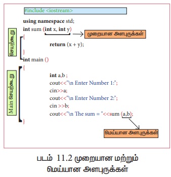 1. முறையான அளபுருக்கள் (Formal Parameters) மற்றும் மெய்யான அளபுருக்கள் (Actual Parameters) அல்லது செயலுருபுக்கள் (Arguments)