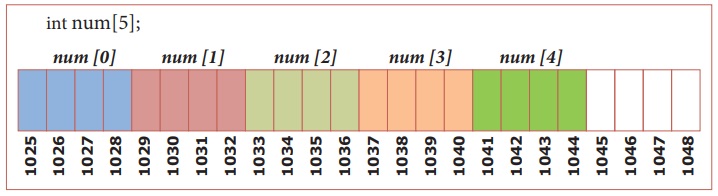 மேலே கொடுக்கப்பட்டுள்ள படத்தில், num என்ற அணியானது 5 உறுப்புகளைக் கொண்ட முழு எண் அணி என்பது காட்டப்பட்டுள்ளது. Dev - C++ நிரல் பெயர்ப்பியானது, ஒவ்வொரு int தரவுவகை மாறிக்கும் 4 பைட்டுகள் (bytes) நினைவகத்தை ஒதுக்கீடு செய்யும். 5 உறுப்புகளை கொண்ட இவ்வணிக்கு, ஒவ்வொரு உறுப்புக்கும் 4 பைட்டுகள் விதம் மொத்தமாக 20 பைட்டுகள் ஒதுக்கப்படும்.