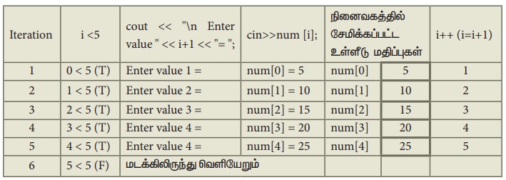 இந்த for மடக்கு 5 முறை இயங்குமாறு வடிவமைக்கப்பட்டுள்ளது. ஒவ்வொரு முறையும் மடக்கு இயங்கும் போதே "Enter value” என்ற அறிக்கையை cout கூற்று வெளியிடும். மேலும் cin மூலம் உள்ளீடு மதிப்பு பெறப்பட்டு num [i] என்ற அணியில் சேமிக்கப்படும்.