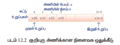 மேற்கண்ட எடுத்துக்காட்டில் ‘age' என்ற அணியின் அளவானது 5 ஆகும். இதில் முதல் உறுப்பு age[0]ல் 19 என்ற எண் சேமிக்கப்பட்டிருக்கும், உறுப்பு age[1]ல் 21 என்ற எண் சேமிக்கப்பட்டிருக்கும், இது போல மற்ற உறுப்புகளிலும் கொடுக்கப்பட்டுள்ள எண்கள் சேமிக்கப்பட்டிருக்கும். (பார்க்க படம் 12.1)