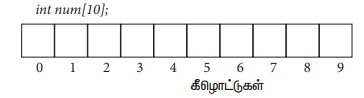 மேலே அறிவிக்கப்பட்டுள்ள "num” என்ற அணியானது 10 முழு எண் மதிப்புகளை சேமிக்கும் அணியாகும். (முழு எண் தரவு வகையைச் சார்ந்த 10 பல்வேறு மதிப்புகளை நினைவகத்தில் சேமிக்கலாம்).