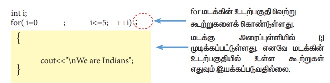 மேலே கொடுக்கப்பட்டுள்ள நிரலில் for மடக்கின் இறுதியில் அரைப்புள்ளி இடம்பெற்றுள்ளதால், நெளிவு அடைப்புக்குறியில் இடம்பெற்றுள்ள மடக்கின் உடற்பகுதி இயக்கப்படாது.