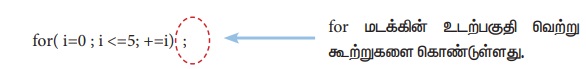 மேலே கொடுக்கப்பட்டுள்ள நிரலில், தொடக்க மதிப்பிருத்தம் மற்றும் மிகுப்பு கோவை தரப்படவில்லை. ஆனால், இரண்டு பகுதிகளையும் குறிக்க அரைப்புள்ளி மட்டும் பயன்படுத்தப்பட்டுள்ளது.