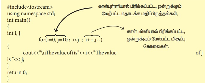 மேலே கொடுக்கப்பட்டுள்ள எடுத்துக்காட்டில் தொடக்க மதிப்பிருத்தலின், i மற்றும் j என்ற இரு வேறு மாறிகள் பயன்படுத்தப்பட்டுள்ளது. அதே போன்று, i++ மற்றும் j++ என்ற இரண்டு மிகுப்புக் கோவைகளை கொண்டுள்ளது. இவ்விரு மாறிகளும் காற்புள்ளியால் பிரிக்கப்பட்டு வரிசை முறையில் வைக்கப்பட்டுள்ளது. அதாவது தொடக்க மதிப்பு இருக்கும் போது i ன் மதிப்பு 0 எனவும் j ன் மதிப்பு 10 எனவும் கருதப்படுகிறது. மிகுப்பு கோவை i++ முதலில் மிகுக்கப்படும், பின்னர் j-- மிகுக்கப்படும்.