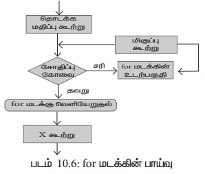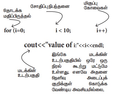 for (தொடக்க மதிப்பிருத்தல்; சோதிப்பு நிபந்தனை; மிகுப்பு கோவைகள்)